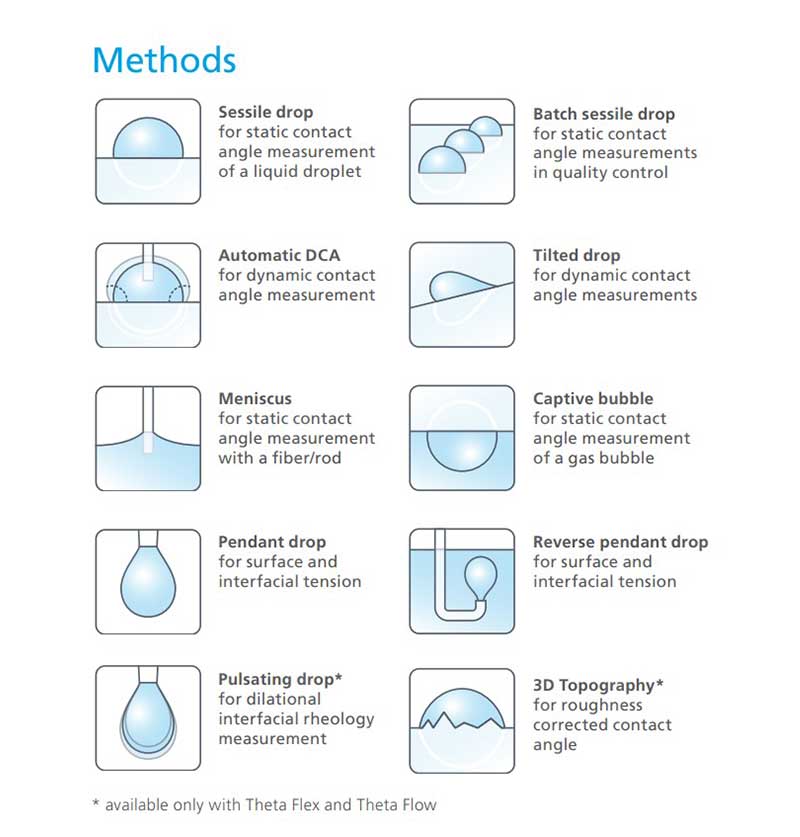 User-friendly interface – quick start of analysis Full automation – fast and objective results Automatic baseline and drop shape analysis – simple and accurate Batch mode – fast analysis of many samples and data points Meniscus analysis – CA for fibers Automatic control of liquid phase purity – reliable results Fully automatic analysis of dynamic contact angle – no subjective influence from users